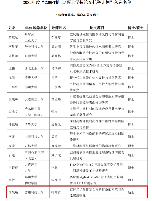 近日,中国微米纳米技术学会(CSMNT)公布了2025年度“CSMNT博士/硕士学位论文托举计划”评选结果,材料学院2024届研究生俞朱敏的硕士学位论文《胶体光子晶体复合材料体系的构筑与性能应用研究》成功入选。