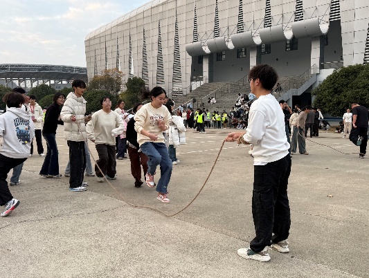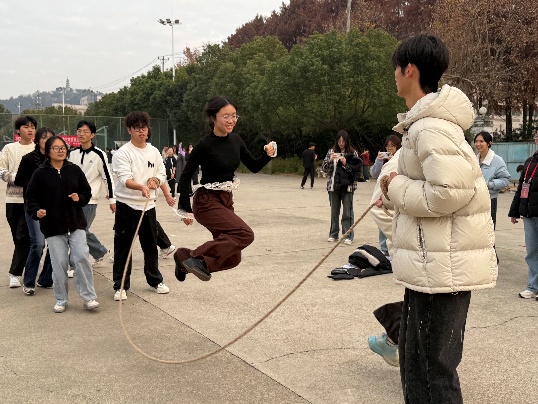 集体跳大绳赛场人声鼎沸,气氛热烈。各学院代表队依次登场,队员们目光专注,脚步轻盈,看准节奏鱼贯而入,在绳起绳落间灵活跃动,每一次顺利通过都引来阵阵喝彩。