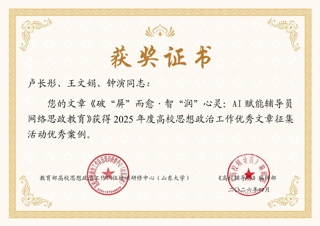 近日,教育部高校思想政治工作队伍培训研修中心(山东大学)、《高校辅导员》编辑部公布了2025年高校思想政治工作优秀文章征集活动评选结果。材料科学与工程学院卢长彤、王文娟、钟演撰写的案例《破“屏”而愈·智“润”心灵:AI赋能辅导员网络思政教育》获评全国高校思想政治工作优秀案例。