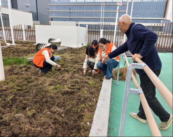 午后的庭院里,身着橙色马甲的志愿者们手持锄头、小铲,与护理院长辈们一同投入劳作。大家分工协作,挥锄翻松板结的泥土,用铲子将土块敲碎整平;蹲身清理杂草枯枝,不放过边角缝隙;栽种环节中,扶苗、培土、压实、浇水,每个步骤有条不紊。经过共同努力,原本沉寂的庭院里,新翻的泥土整齐平整,一排排花苗迎风挺立。