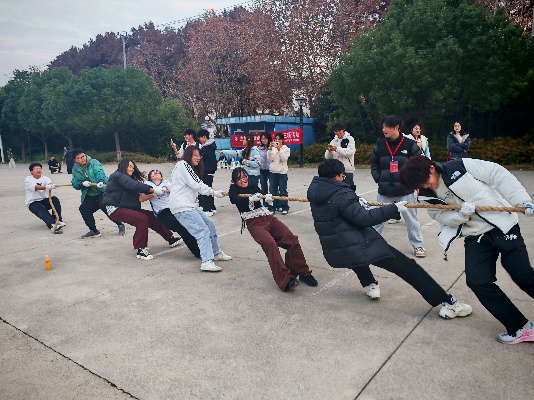 拔河比赛现场,双方队员扎稳马步、身体后仰,双手紧握绳索,跟随指挥的号子,以整齐的节奏向后发力,每一寸进退都牵动人心,拉拉队的加油声响彻操场。